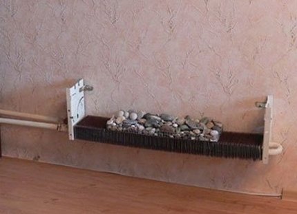 - Volgens die skets is die raam bedek met laaghout. Aangesien daar 'n radiator binne is, moet die struktuur met skroewe vasgemaak word. Na 'n rukkie kan die voorkoms van die klipstruktuur aangepas word deur toevoegings. Hier word die podium by die portaal gevoeg.