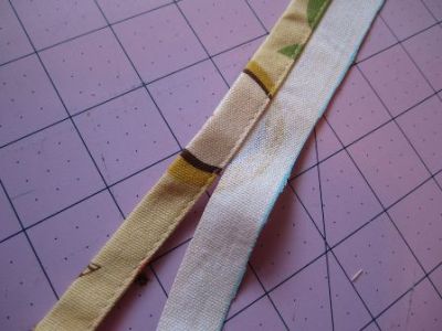 - Vir potholders, ons het 'n multi-gekleurde stroke stof (natuurlik natuurlike en digte) 25 cm in lengte en 3-4 cm in breedte. Spandeer die stroke sorgvuldig met mekaar en verlaag die toelaes aan die een kant.