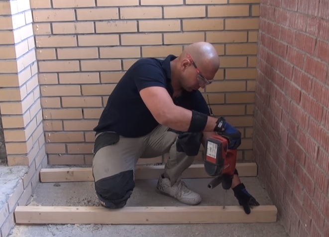 - Anker word gebruik vir bevestiging. Boor eers 'n boom met 'n boor, dan die beton met 'n perforator. Elke balk is vasgemaak met twee ankers.