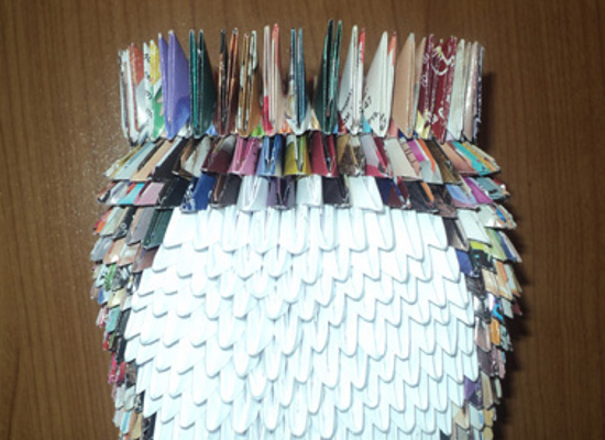 - Op hierdie stadium eindig die meesterklas vir die maak van die modulêre origami kat die bors- en kleurreeks weer. Om die kop en romp bymekaar te maak, voeg nog drie witmodules in die middelste deel by.