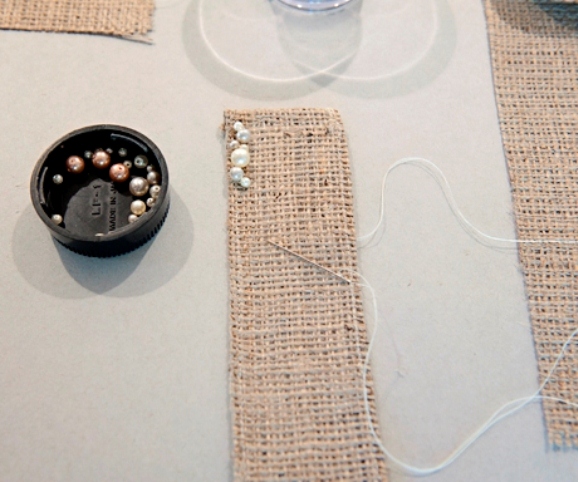 7. Aan die kante heg ons pêrels in willekeurige volgorde aan. Naaldwerkkrale, probeer om die rande effens vas te maak sodat hulle nie verkrummel nie.