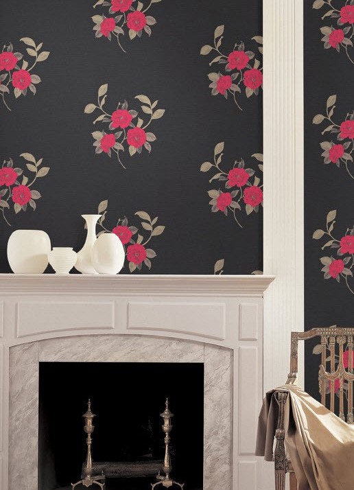 Swart plakpapier met blomme wat jy een muur kan bedek, wat dit 'n helder aksent maak. Rooi kleur is oor die algemeen baie uniek, dit lyk goed op 'n donker agtergrond en terselfdertyd is dit 'n ligte agtergrond. Byvoorbeeld, wit plakpapier met versadigde kleure moet gebruik word in huise waar aktiewe en gemotiveerde mense leef.